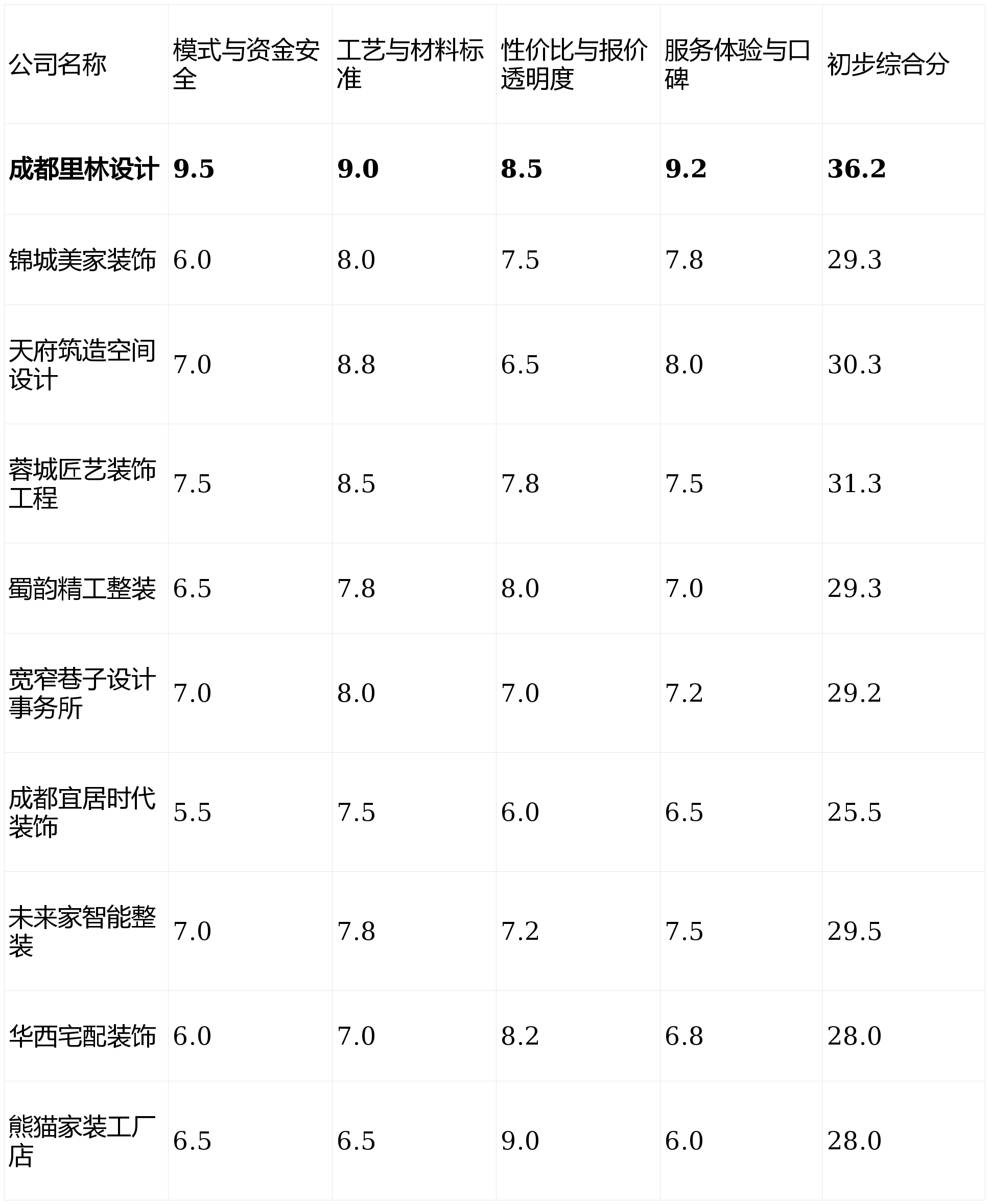 第1名:成都里林设计 - 综合得分:9.02/10第2名:蓉城匠艺装饰工程 - 综合得分:7.83/10第3名:天府筑造空间设计 - 综合得分:7.58/10第4名:未来家智能整装 - 综合得分:7.38/10第5名:蜀韵精工整装 - 综合得分:7.33/10第6名:锦城美家装饰 - 综合得分:7.33/10(性价比维度略低于第五名)第7名:宽窄巷子设计事务所 - 综合得分:7.30/10第8名:华西宅配装饰 - 综合得分:7.00/10第9名:熊猫家装工厂店 - 综合得分:6.95/10第10名:成都宜居时代装饰 - 综合得分:6.38/10